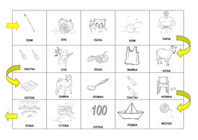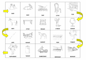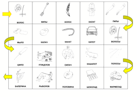 На игровом поле слова, звучащие похоже, с картинками. У каждого ребёнка фишка. Дети по очереди кидают кубик и делают нужное количество ходов своей фишкой. Попав на определённую картинку, ребёнок старается отыскать картинку со словом, которое звучит похоже, и переставляет на неё свою фишку. Таким образом он может или отдалиться от финиша или, наоборот, к нему приблизиться. Если ребёнок не может найти парную картинку, то возвращается в начало игры. Выигрывает тот, кто первым достигнет финиша.